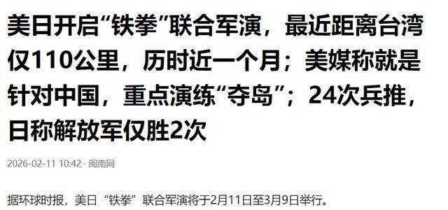 1、2026-02-11 闽南网 美日“铁拳”结合军演,比来距离仅110公里,历时近一个月;美媒称就是针对中国,沉点练习训练“夺岛”;24次兵推,日称解放军仅胜2次。